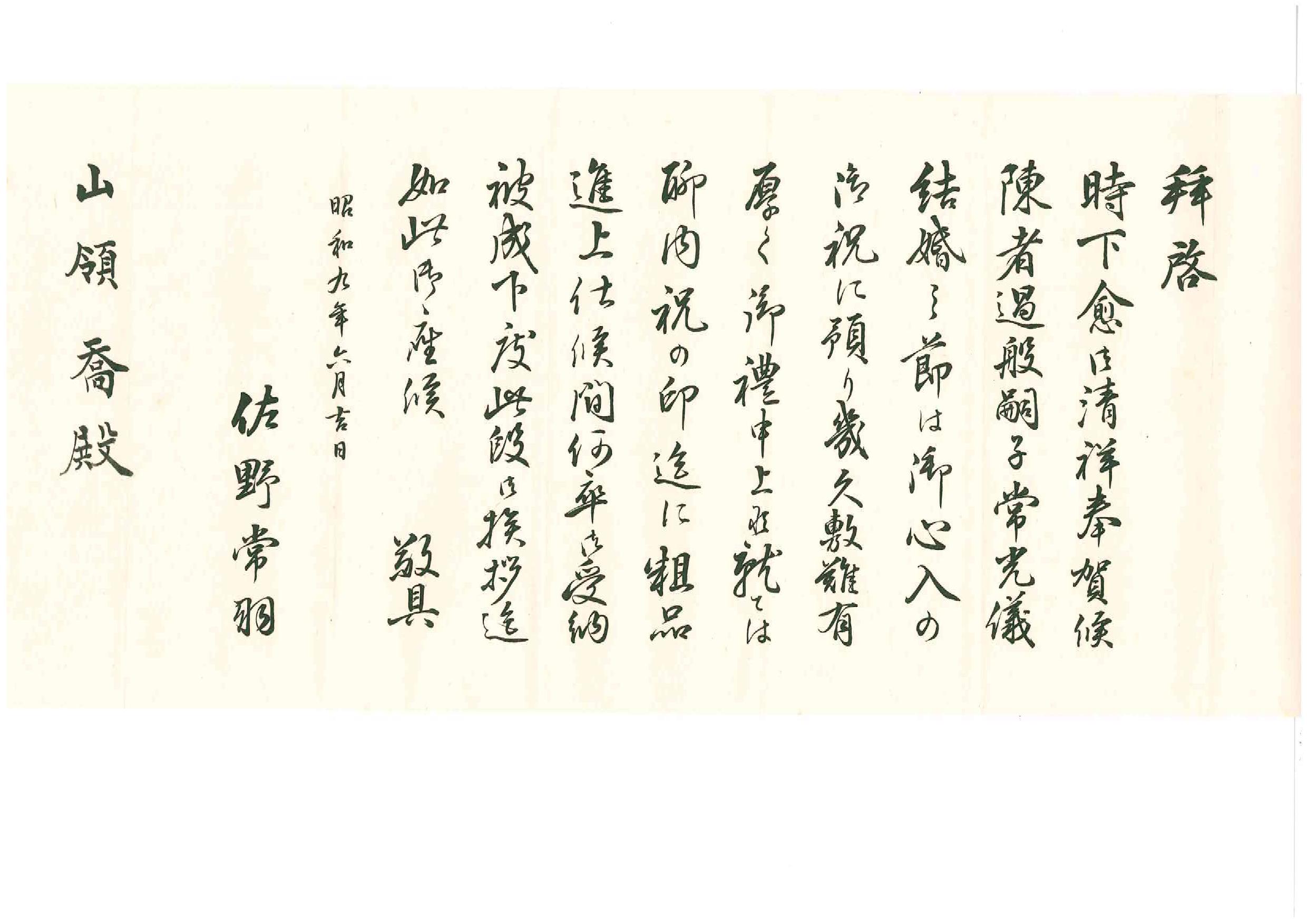 内容を読むと、佐野常羽の養子である佐野常光(一条実輝公爵の次男)と皇族(竹田宮恒久王の第1王女)の禮子(あやこ)様との結婚に際して、私の祖父が佐野常羽に御祝いを贈ったことに対するお礼の手紙であることがわかります。